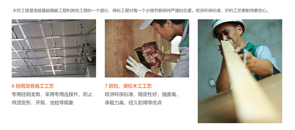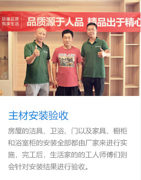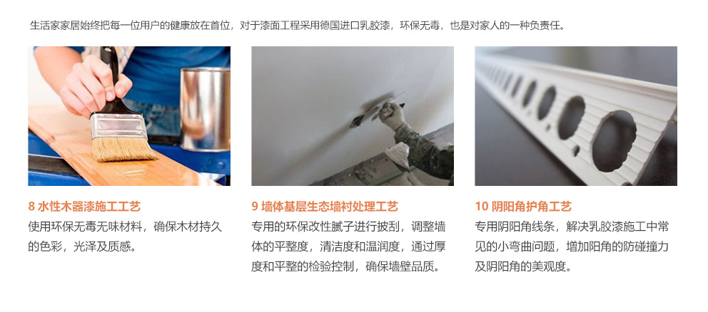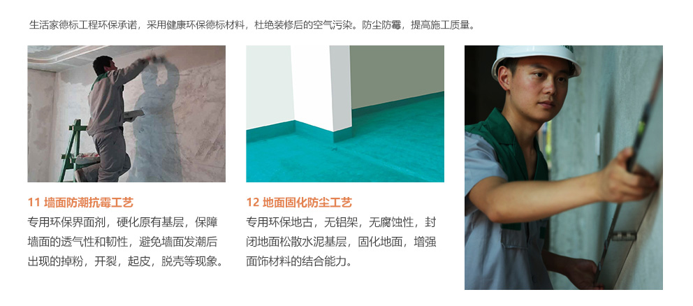 環(huán)保家裝標(biāo)準(zhǔn)體系(環(huán)保設(shè)計(jì),環(huán)保材料,環(huán)保施工,環(huán)保檢測)和環(huán)保家裝生態(tài)系統(tǒng)(六大節(jié)點(diǎn)控制—入住前空氣檢測,家居環(huán)保無菌處理,人性化環(huán)保設(shè)計(jì),殘留污染再處理,施工過程監(jiān)控,環(huán)保材料使用)全方位提供五星級(jí)高品質(zhì)家裝服務(wù);