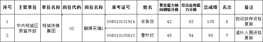 根據(jù)《2023年衢州市柯城區(qū)屬事業(yè)單位公開招聘公告》規(guī)定,因部分崗位入圍資格復審的考生確定放棄資格復審資格,在對應崗位中按筆試成績從高分到低分予以遞補,若遇最后一名同分的,則一并列入資格復審,現(xiàn)將2023年區(qū)屬事業(yè)單位公開招聘柯城傳媒集團“融媒采編1”崗位遞補入圍資格復審人員名單公布如下: